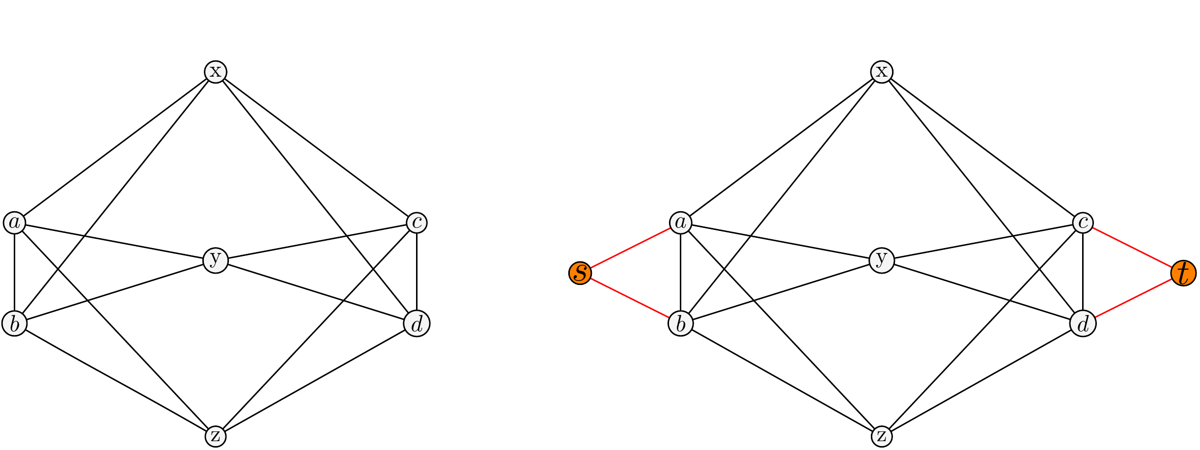 Then we can check that $\{ x, y, z \}$ is the minimum (A, B)-vertex separator. If we simply add a new vertex s connected to all vertices from A, and a vertex t connected to all vertices from B, then we will get the minimum (s, t)-vertex separator $\{a,b\}$ or $\{c,d\}$, but that's not what we want.